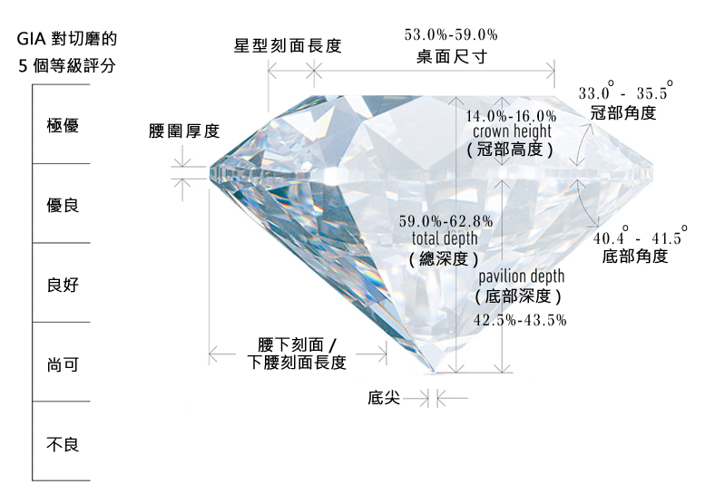 GIA 是按照各種參數因子,包括鑽石的比例、尖底大小、腰圍厚度、磨光及對稱說明...等對其進行分類。